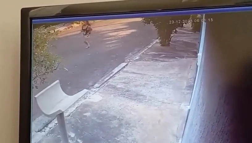 A gravação indica registro de uma câmera de segurança próxima à casa de Vanessa. As imagens começam com a mulher saindo por portão lateral, com short e blusa preta correndo pela rua.