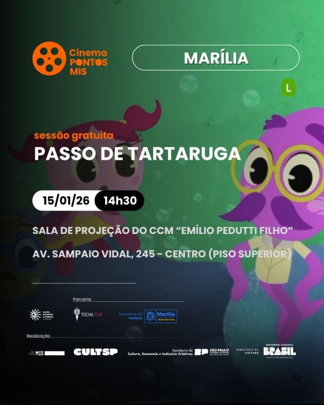 A Prefeitura de Marília, por meio da Secretaria da Cultura, divulga mais uma programação cultural do mês de janeiro, com atividades gratuitas que contemplam o público infantil e apreciadores das artes visuais. A agenda inclui sessões do Cinema Pontos MIS, no Clube de Cinema de Marília (CCM), e a exposição coletiva “Recortes de Nós”, na Galeria Municipal de Artes de Marília. Ambos equipamentos culturais ficam no Complexo Cultural “Braz Alécio”, localizado na Avenida Sampaio Vidal, 245, no centro.