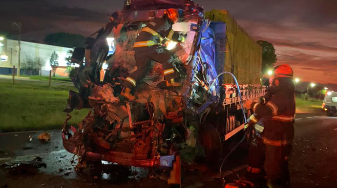 Com o impacto, a carreta Scania R440, que transportava adubo, foi lançada para o acostamento. O caminhão parou entre a faixa de rolamento e o acostamento, com a cabine completamente destruída.
