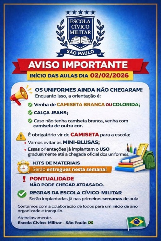 Regras de escola cívico-militar serão implantadas já nas primeiras semanas de aulas. Contamos com a colaboração de todos para início de ano organizado e tranquilo