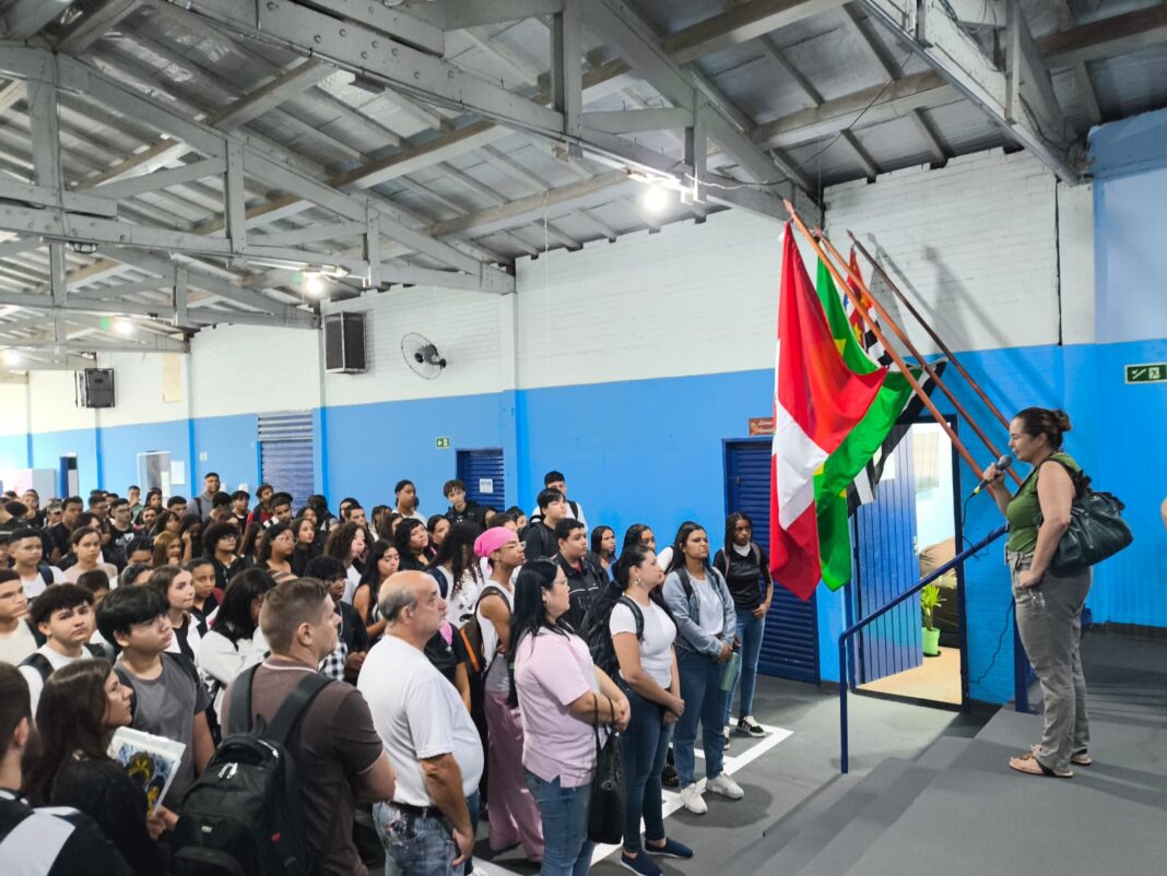 No primeiro dia de atividades na Escola Estadual Professor Benito Martinelli, os alunos participaram da chamada “Ordem Unida”, momento cívico que incluiu o canto do Hino Nacional antes do deslocamento para as salas de aula. Os monitores — que não portam armas e utilizam trajes civis, como camisetas e calças jeans — apresentaram aos estudantes e aos pais o regimento escolar, reforçando a importância do respeito e da convivência harmoniosa.