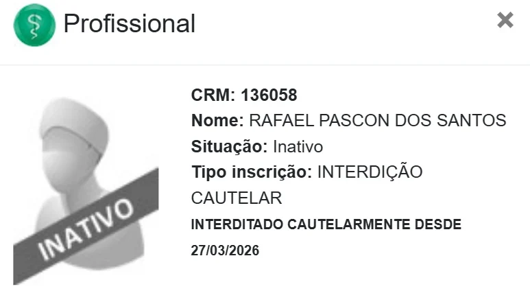 O prazo de suspensão do registro, com interdição total, começou a contar em 25 de março e está em processo ético disciplinar.