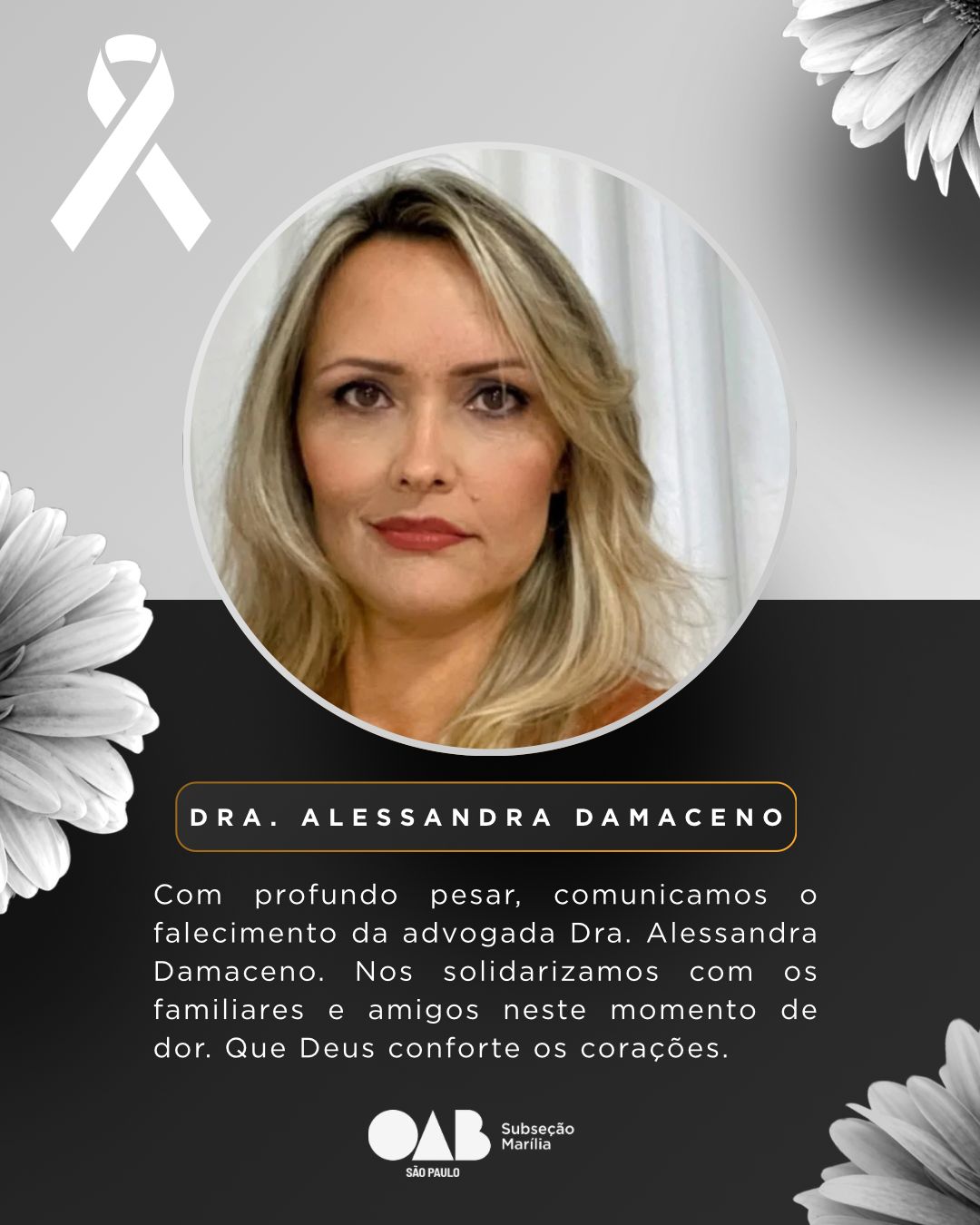 Doutora Alessandra faleceu ontem, domingo, aos 52 anos de idade O sepultamento da advogada Alessandra Damaceno está previsto para ocorrer às 16h30 desta segunda-feira, no Cemitério da Saudade, em Marília. O velório teve início às 8h30, na sala 06 do…