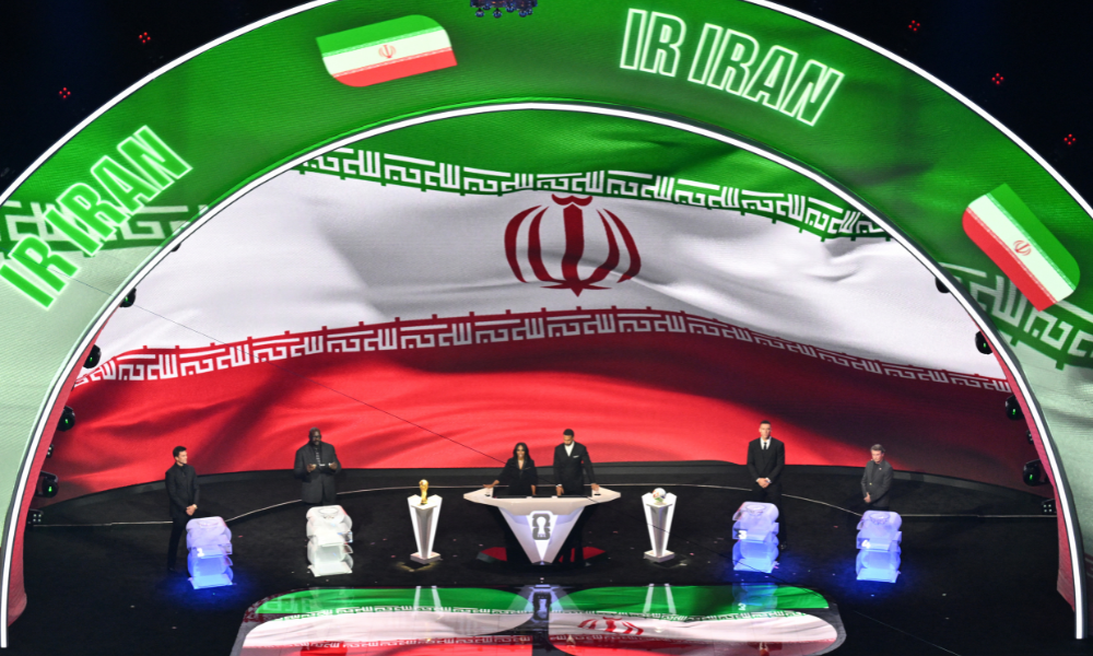 A bandeira do Irã é exibida em um telão durante o sorteio da Copa do Mundo FIFA de 2026, que será realizada nos Estados Unidos, Canadá e México, no Kennedy Center, em Washington, D.C., em 5 de dezembro de 2025. (Foto de Roberto Schmidt / AFP)