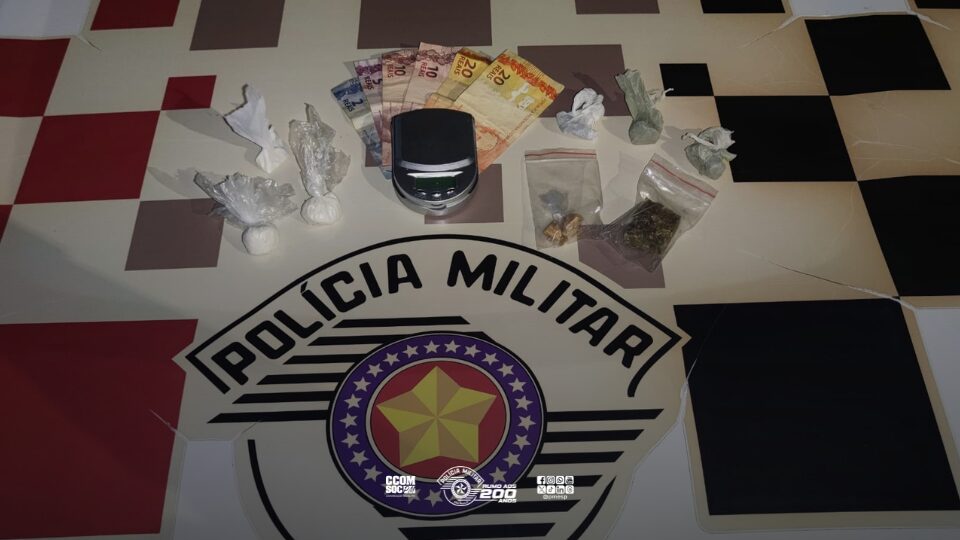 Na sequência, os policiais abordaram o suspeito e realizaram vistoria na residência, onde foram apreendidos R$67,00, uma balança de precisão e diversas porções de entorpecentes já fracionadas, entre cocaína, crack e maconha.