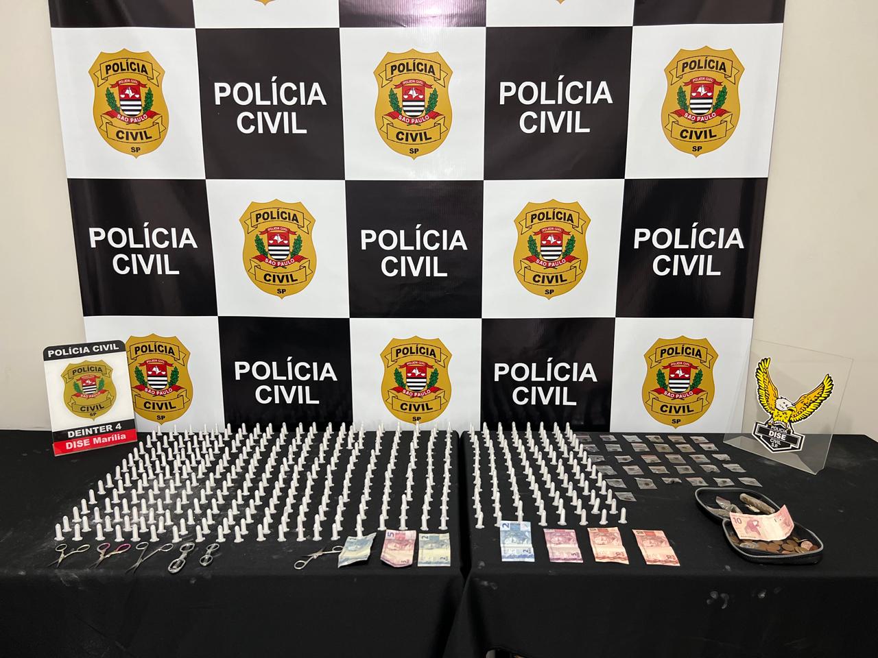 Na mesma bolsa, havia ainda cinco tesouras pequenas e R$ 18 entre notas e moedas, o que, segundo a polícia, pode estar associado ao fracionamento e preparo da droga.