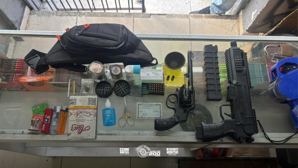 Questionado, o proprietário do estabelecimento informou ser usuário de drogas e autorizou a entrada da equipe no imóvel. No interior do local, os policiais localizaram pequena quantidade de entorpecente. Durante a vistoria, também foram encontrados um revólver calibre .38, da marca Smith & Wesson, com numeração suprimida, munições de diferentes calibres, uma arma de airsoft do tipo submetralhadora, além de outros objetos relacionados ao uso de drogas.