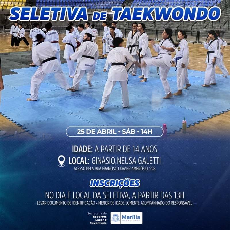 A Prefeitura de Marília, por meio da Secretaria Municipal de Esportes, Lazer e Juventude, realiza no próximo sábado, dia 25 de abril, às 14h, a seletiva de Taekwondo 2026. A ação tem como objetivo identificar novos talentos da modalidade para integrar a Seleção Mariliense de Taekwondo, que representa o município em competições oficiais.