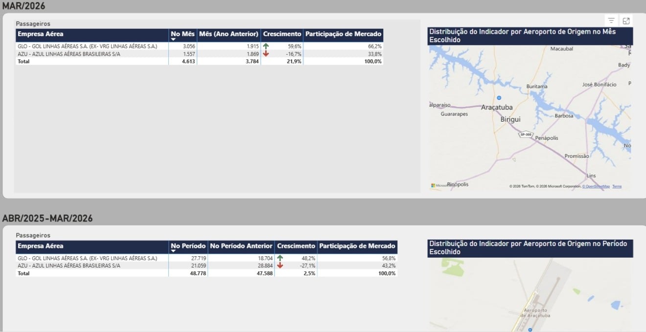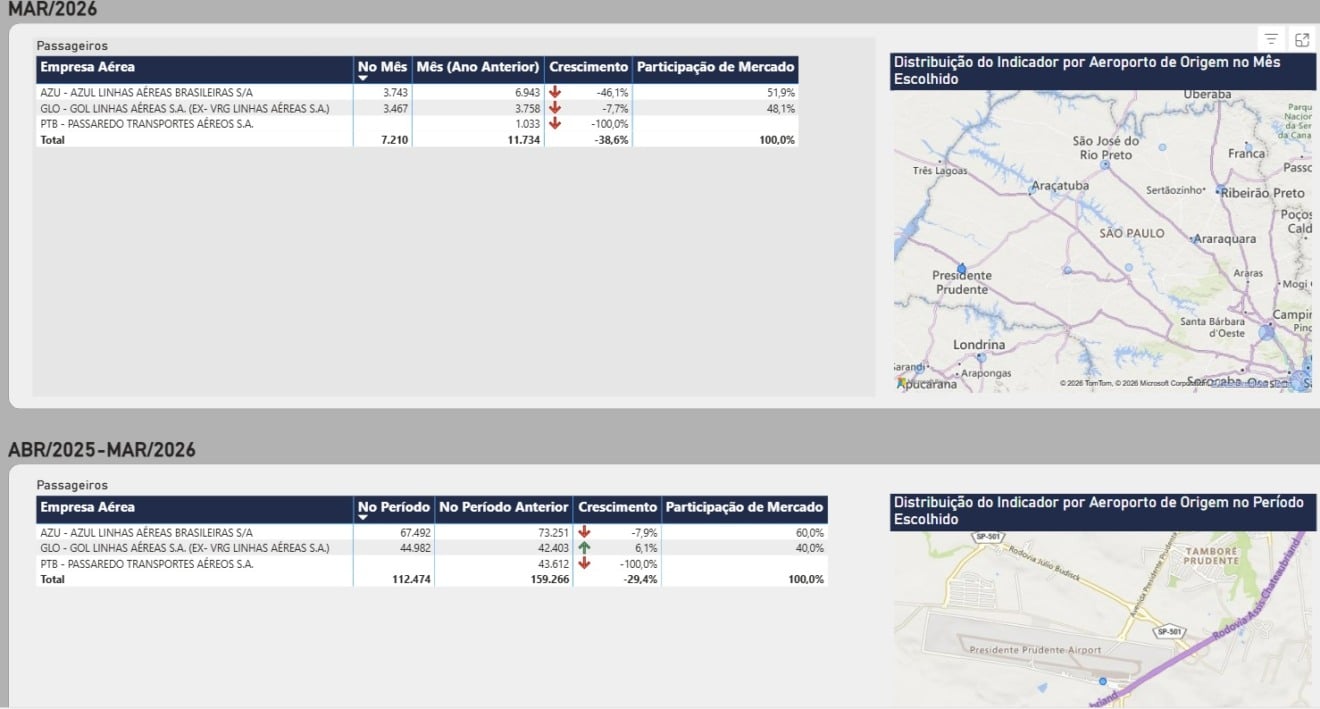 O número foi menor, inclusive, na variação anual. Entre abril de 2025 e março de 2026 a queda foi de 27,4%. O número de passageiros caiu de 17.320 em 12 meses para 12.568.