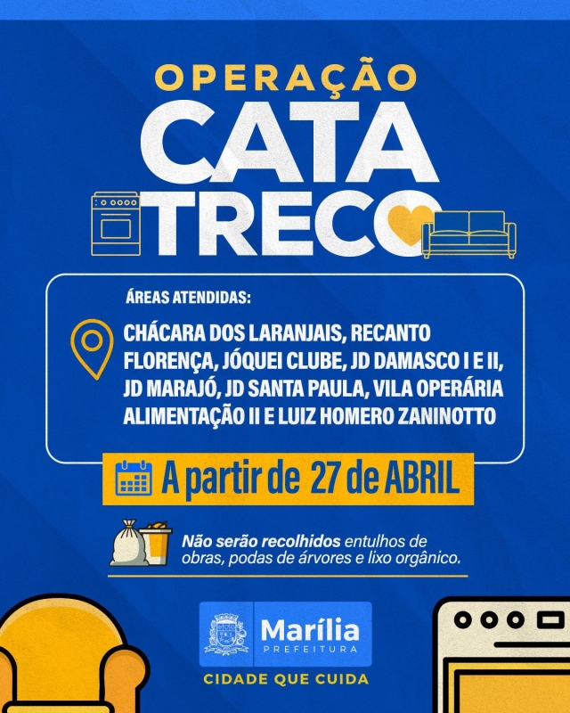 A Prefeitura de Marília, por meio da Secretaria Municipal do Meio Ambiente e de Serviços Públicos, dará continuidade à Operação Cata-Treco a partir do próximo dia 27 de abril, atendendo novos bairros do município. A ação tem como objetivo auxiliar a população no descarte adequado de materiais inservíveis, contribuindo para a limpeza urbana e a prevenção de problemas ambientais e de saúde pública.
