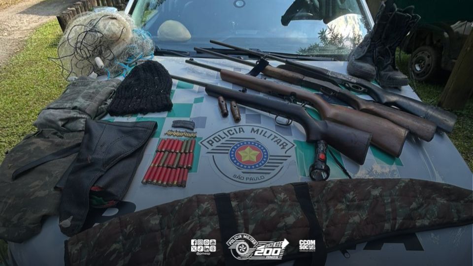 Também foram localizados equipamentos e vestimentas comumente associados à prática criminosa, como lanterna, touca tipo balaclava, coturno e fardamento camuflado, além de petrechos utilizados na caça, como dois pios (chamariscos) e uma rede de pesca.